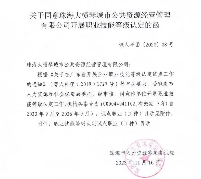 通過該項備案申請后,當前,大橫琴城資可面向公司職工組織開展職業技能等級認定工作,包括評價規范的制定、評價的方式、指標的設定、具體的實施、認定公示和證書的核發等。
